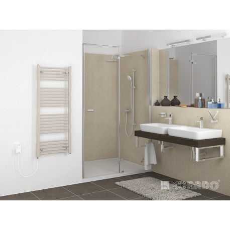Der Badheizkörper ist mit Wärmeträgerflüssigkeit gefüllt und frostsicher bis -20°C. Der eingeschraubte Heizstab ist mit einem angebautem Regelthermostat von 30 bis 60°C Heizkörpertemperatur in 10°K Stufen einstellbar. Das Gerät besitzt einen Ein/Aus-Schalter mit LED-Anzeige und eine 1,5m lange Steckeranschlussleitung.